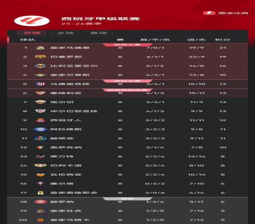 西甲第8輪后積分榜:皇馬2分優(yōu)勢領(lǐng)先巴薩,馬競第5