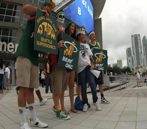 而相比于此前的比賽,這次比賽背后的意義相當(dāng)深刻,這是他們?cè)谖餮艌D的最后一場(chǎng)主場(chǎng)比賽。球迷們?cè)趫?chǎng)邊揮舞著“Save Our Sonics”的橫幅,淚水掌聲之下,悲情和遺憾交織一片。沒(méi)人愿意相信,這支曾經(jīng)拿過(guò)總冠軍、讓全城球迷為之瘋狂的球隊(duì),就這樣要離開了。