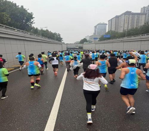 早上四點(diǎn)四十起床,六點(diǎn)半不到便存好包,與教練和伙伴們集合、拍照、檢錄、熱身,等待那一聲發(fā)令槍響。萌萌與我一路相伴,同為首馬選手,我們賽前再次確認(rèn)節(jié)奏:前三四公里要相互提醒一定不要被帶節(jié)奏,看手表壓配速壓心率;三四公里以后憑體感提速到合適的速度巡航;最后五公里,“放手一搏”!這是遠(yuǎn)在新疆的吳教練反復(fù)叮囑的策略,就怕我們第一次參賽過(guò)于亢奮,前面跑太快導(dǎo)致后程崩盤(pán)。龍井教練前一天也一再?gòu)?qiáng)調(diào):首馬,完賽就是勝利!